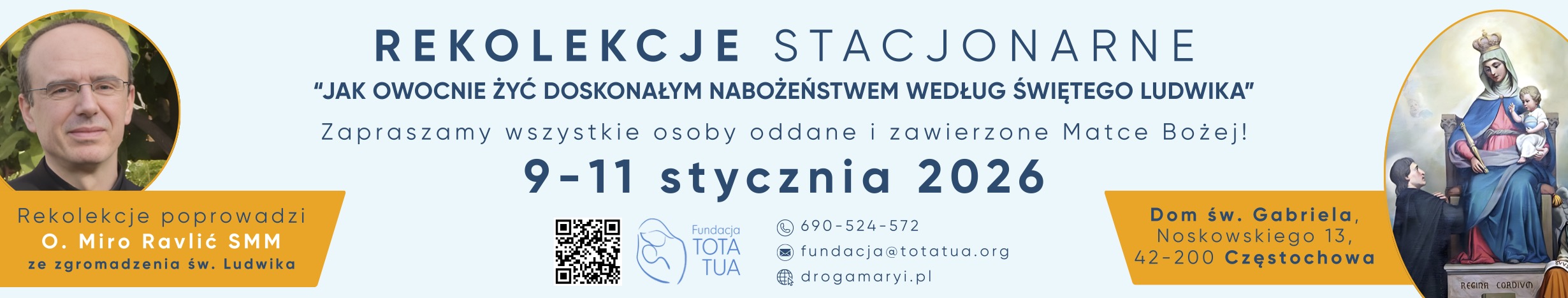 Fundacja Tota Tua oraz o. Monfortanie serdecznie zapraszamy na stacjonarne rekolekcje formacyjne. Zaproszenie kierowane jest szczególnie do wszystkich, którzy przeżyli 33-dniowe rekolekcje oddania się w niewolę miłości według zaleceń świętego Ludwika Maria de Montfort.